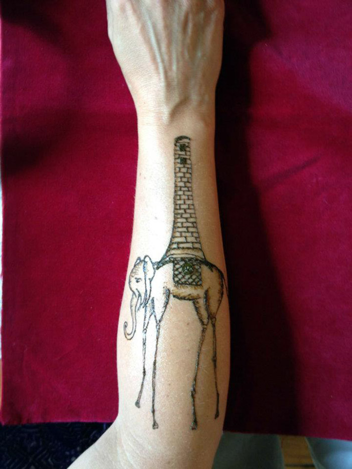 I love Salvador Dali and elephants, so of course I love the convergence. This is henna applied to me by a local artist who got way into her research and added the phonetic spelling for non sequitur, “it does not follow.”