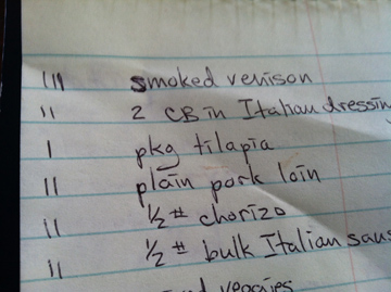 I was pleasantly surprised. There’s enough meat in the freezers already for 37 meals, everything from whole venison tenderloin to inexpensive pork loin snagged from wholesaler Blue Knight Foods. There’s ground venison, made from the scraps we take to Larry’s Meat Market and supplemented there with 20 percent ground pork to add some fat. There are chicken breasts, bought in bulk, cut into portions and dumped into freezer Ziploc bags to marinate in Italian dressing.