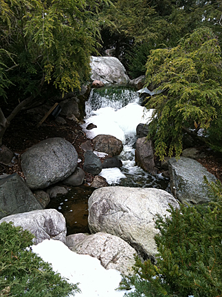 The gardens look very different in the winter-almost-spring, with ice formations on the waterfall.