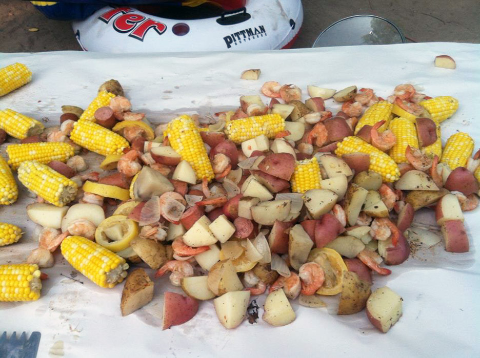 Low Country boil. Possibly the best camp dinner ever. And because we are newspaper people, we brought an end roll for serving.