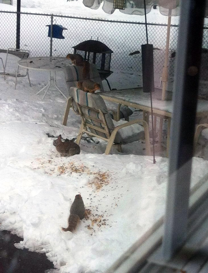 I just saw a squirrel hop down and land square on top of a bunny that was out eating at a very late 8:20 a.m. The scene immediately before: