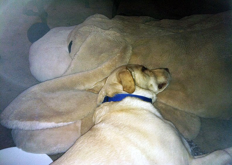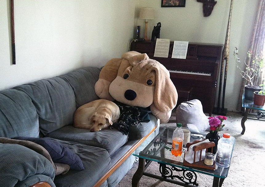 One day I came home and there was a giant stuffed dog on the sidewalk leading up to the porch. Turns out my son had spotted and salvaged it. Right now it is a fixture in the living room.