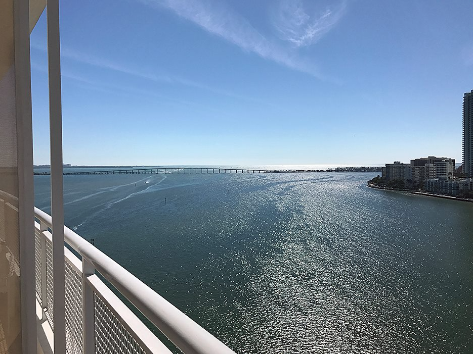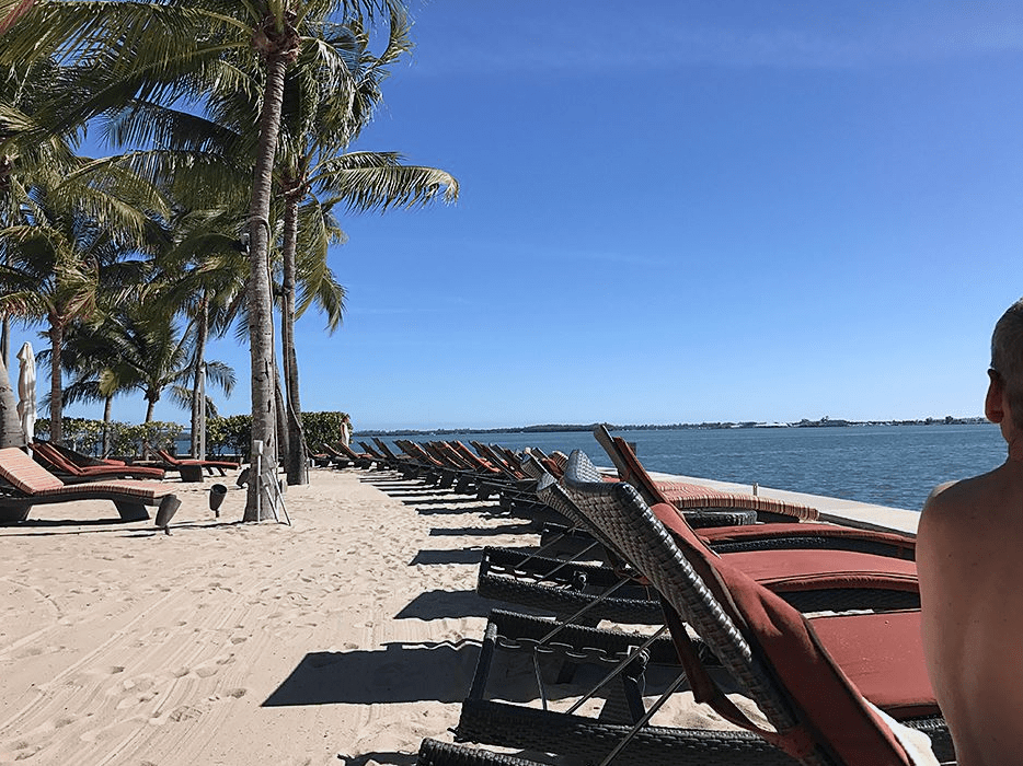 Daytime view from our terrace, where we spent a good bit of time hanging out barefoot in hotel bathrobes. In Biscayne Bay below, we saw bull sharks and rays.