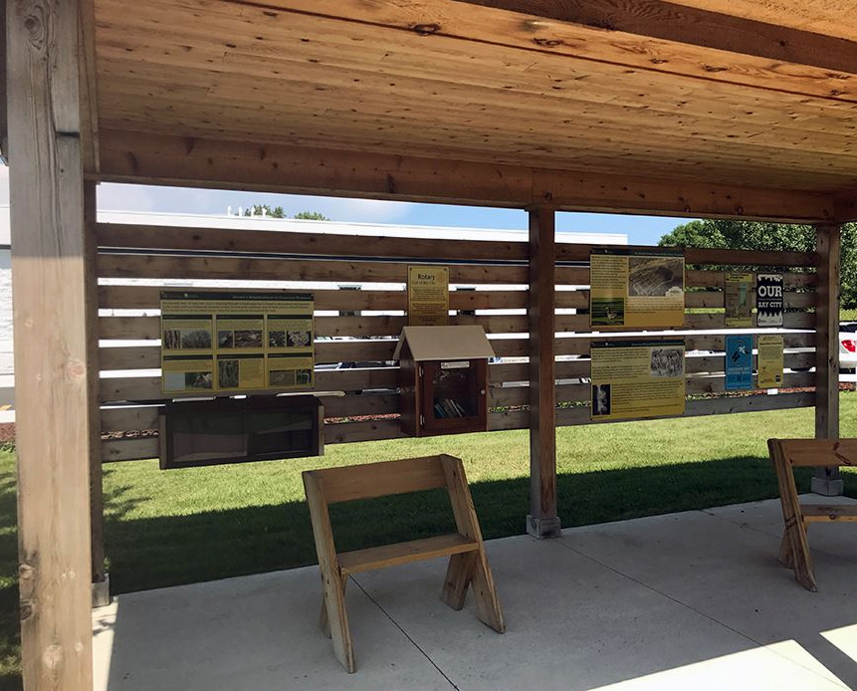 Like I said, cattycorner from the Little Free Library is a spot for littles to climb and hide and play. In the background is Keit’s, our neighborhood nursery and still my favorite spot to buy plants after nearly 25 years. Discovery Preserve was called the Linear Park until the Saginaw Bay Land Conservancy took it over. Signage, I understand, was written by Janea Little, a familiar name to Chippewa Nature Center fans (ask me about the pig skull story).