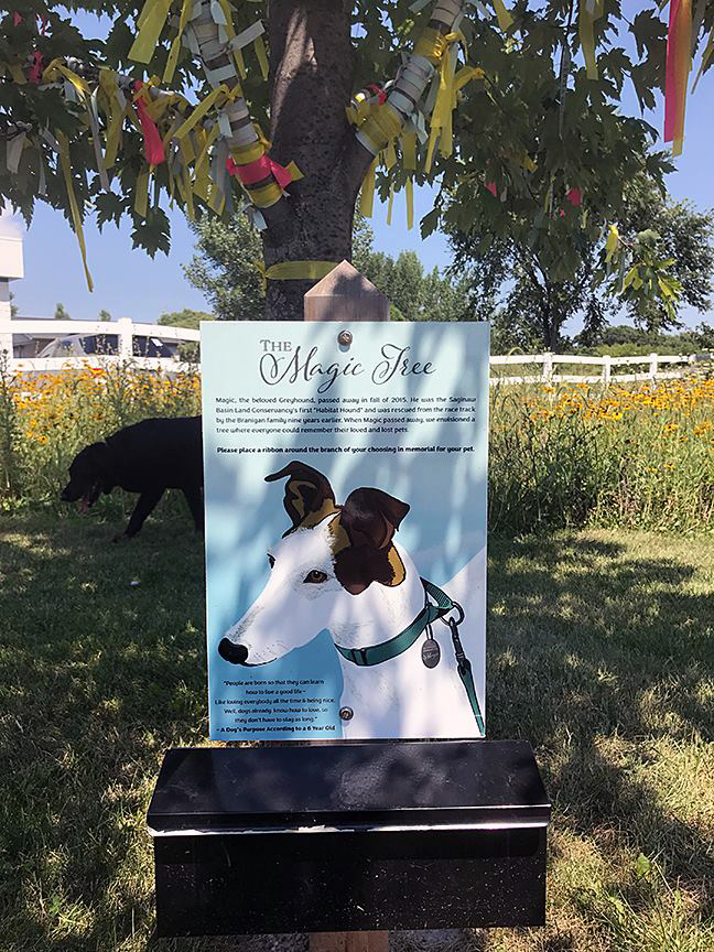Just past the library shelter is the Magic Tree, named for Magic, a greyhound rescued from the race circuit. The box holds ribbons upon which people are invited to write the names of their beloved deceased animals, then tie around any tree branch they choose. (Yes, that is the Lab assistant in the background.)