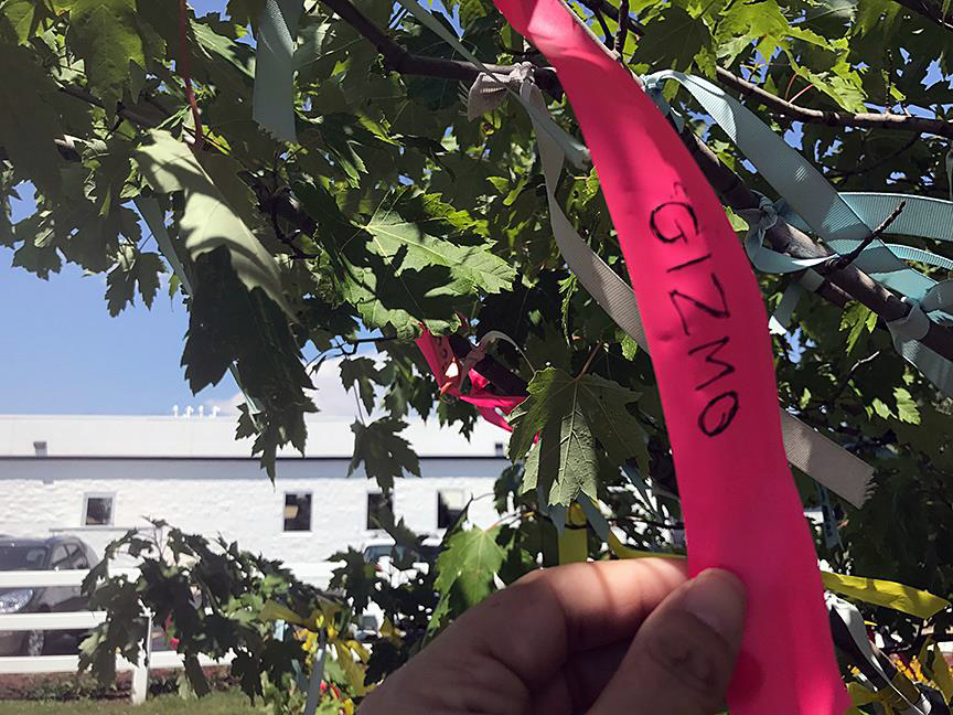 I chose to memorialize my rescued cat, my most recent pet death, but likely will be back to inscribe ribbons for our first cats, a brother-sister pair. I’ll see if my husband wants to commemorate his two Brittanys as well. And then I hope we have no cause to write on ribbons for a very long time.