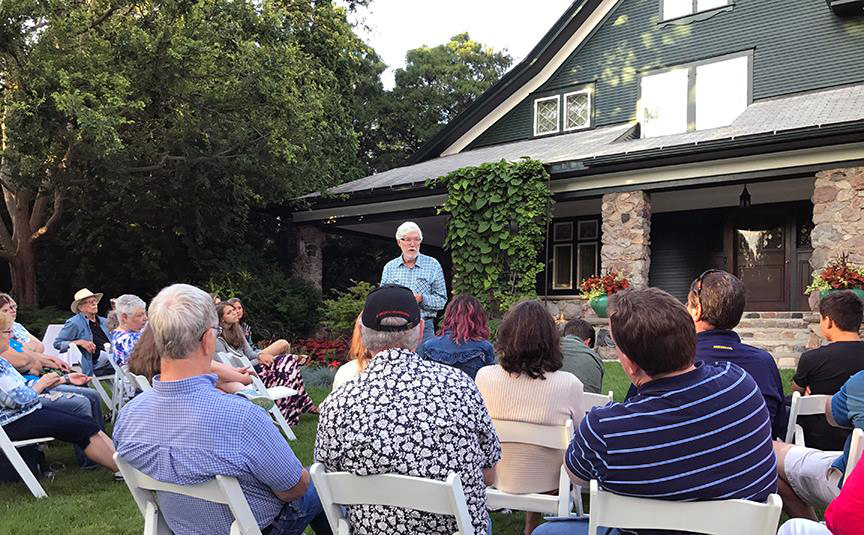 Dow Gardens tonight. As one of the five poets reading said, “It gives me hope for the world when we have to add more chairs at a poetry reading.” I counted 56 people attending, listened to some meh poems and some quite interesting ones, got a quick look inside the Pines (the former Dow home pictured) and came home with three books, which of course I got signed by the author.