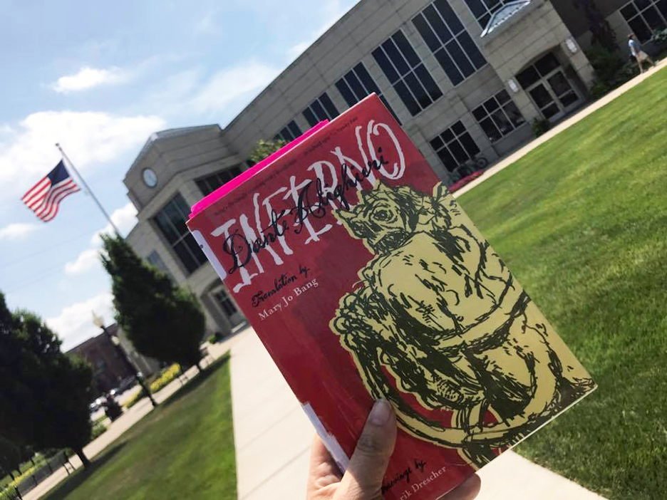 Reading for the weather. Wirt Library in the background.