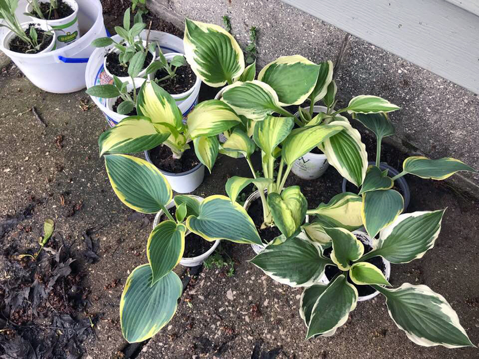 Need hostas? I was driving home and saw a sign by a driveway on East Ashman, between Waldo and Swede. This friendly gentleman divides and repots his own hostas every year, then sells them for $3 each, a quite good price. There are plenty left; he potted 139 just yesterday, and more than 300 between his yard and his son’s. He also has primrose, mint and two kinds of chives, and if you seem inclined to linger he’ll probably walk around his yard with you and talk about how he uses bobbleheads to keep robins from nesting in the decorations.