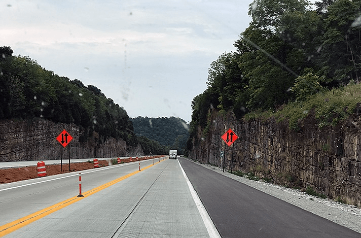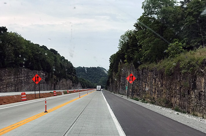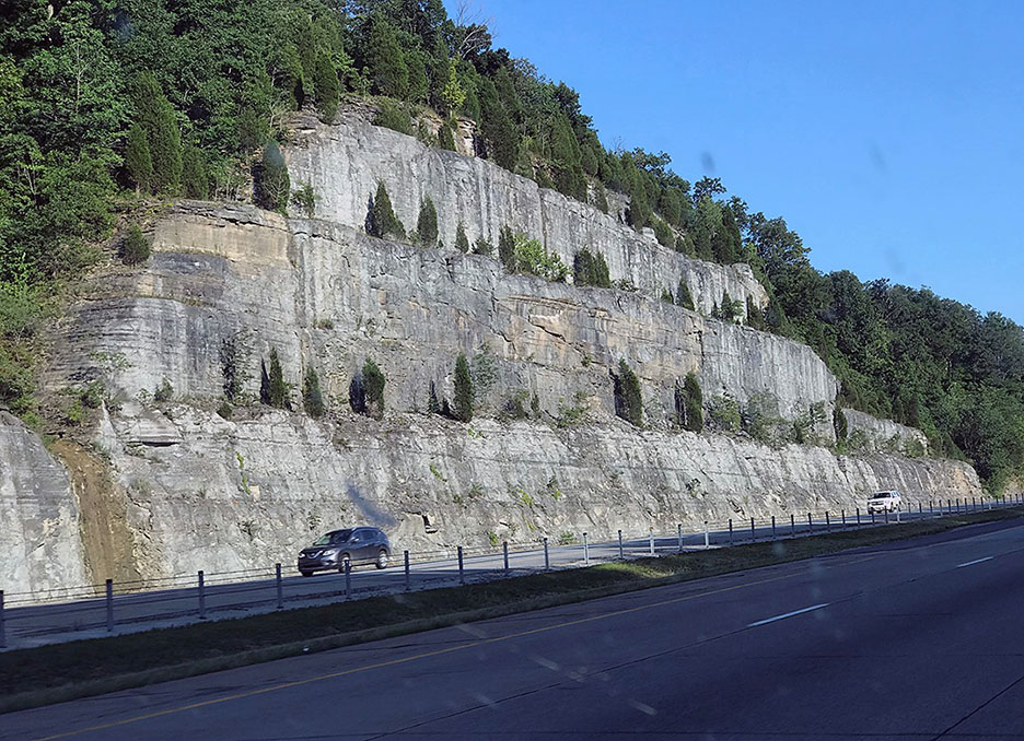 You want flat roads? Sometimes you have to cut them into the hills. This is along I-65, between Louisville (a glorious city and the first place we hit after endless Indiana) and E’town.