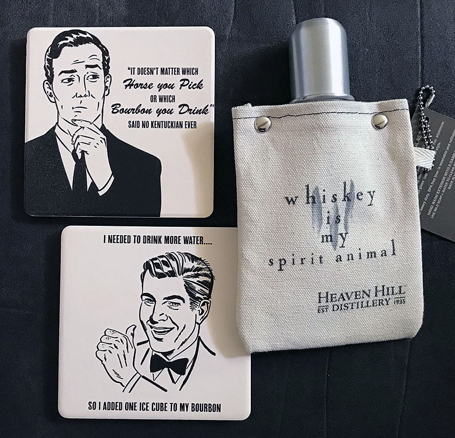 Souvenirs from Heaven Hill. The flask is foldable and the top is a shot; I do appreciate good design.