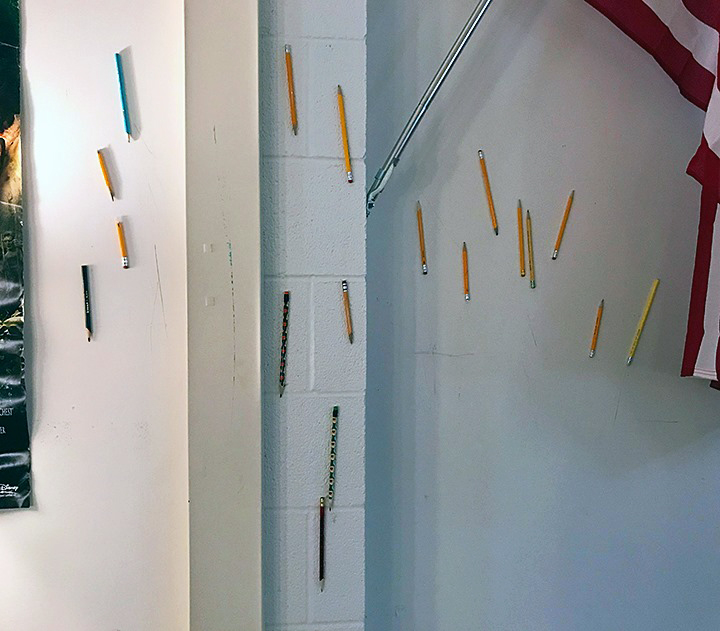 Longer version: One of my English composition students wanted to toss and stick a pencil into a ceiling tile. No, I said, it’ll be a hazard when it falls. He complied but then remembered this trick and went and rubbed a pencil onto the wall, which I was fine with. His buddy had to try it too, and then most of the class got involved and used every spare pencil they could find. It was science, it was bonding and it took maybe five whole minutes, a win all around. After school I instructed the custodian to leave the pencils alone, including any that dropped, so we could track the progress.