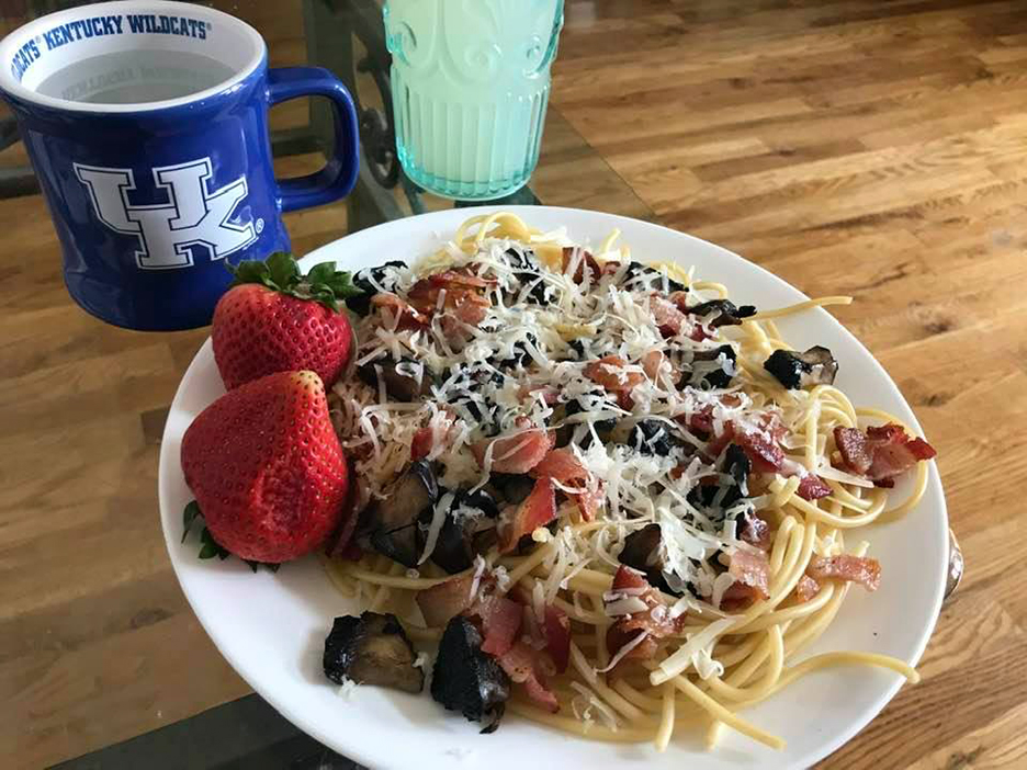 Had leftover spaghetti to use up, check. Had mushrooms that needed cooking soon, check. Bacon and Parm because bacon and Parm.