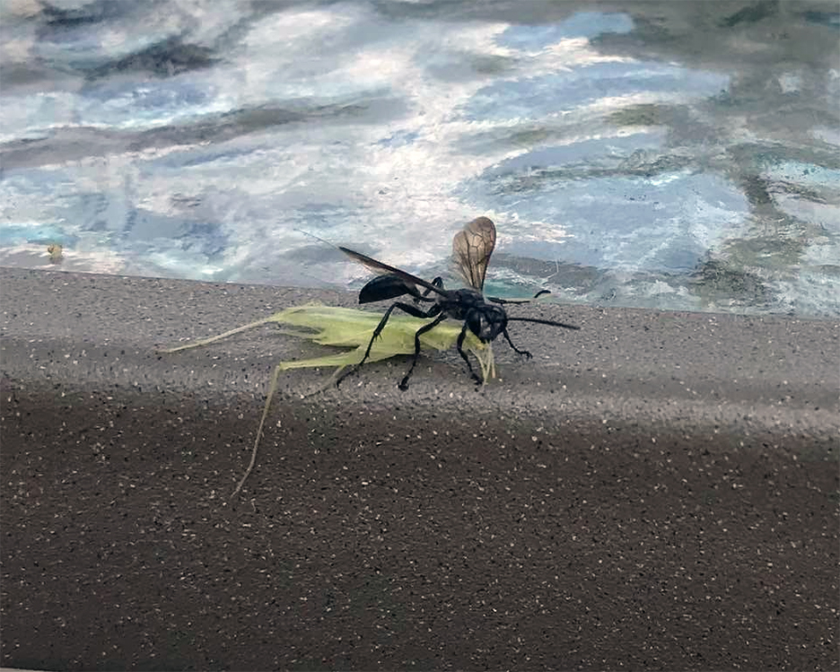 This black insect was flying, landed on my leg, moved to the table, then took off, all silently with its green package. I shared the photo with a friend who’s an entomologist and she said, “It’s a wasp – a solitary wasp. Maybe sphecid of some sort. Prey is a tree cricket.”