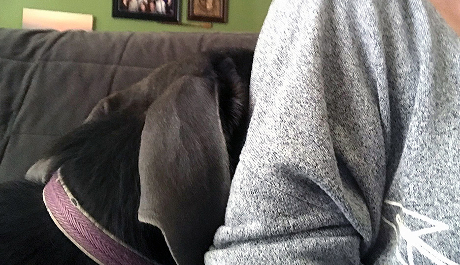 The Lab technician has wedged herself into one of her favorite positions while I work. None of our other dogs did this.