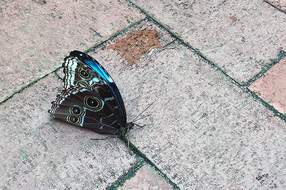 Cool temps had lots of friends on the floor, like this blue morpho. Tread carefully.