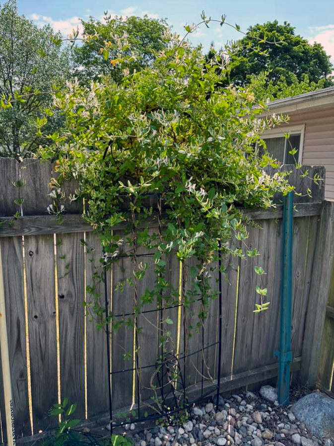 I wish you could smell these. I grew up with honeysuckle piled up on our fence and I love having this bush 500 miles farther north. A full view: