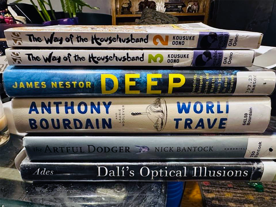 Visited the library today, yay! Walking around to search or browse requires stops, but is doable. I had the two manga on reserve and was specifically looking for the Bourdain and Deep titles, but the art section required poking around.