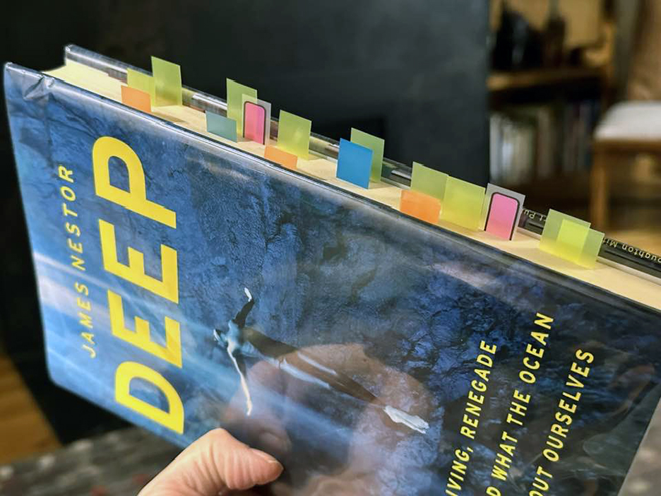 JAN. 22 UPDATE: I read nonfiction articles, but few nonfiction books … until I seized upon this one. My mate saw the stickies and laughed in surprise, and I said they marked topics I need to follow up on, to learn about the current research. This is both work — not paid, just effort — and FUN. And yes, I have other ocean research in my #TBR. Sperm whale clicks, the hadal zone and chemosynthesis in particular intrigue me.