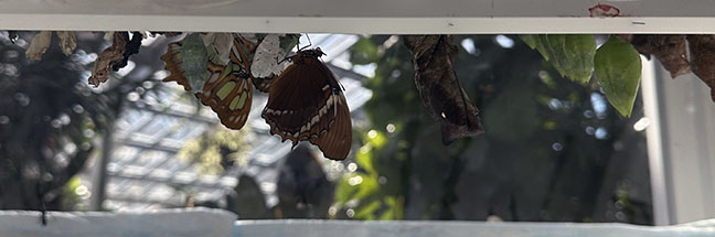 Here’s a butterfly hanging out on a chrysalis to dry. The best-case scenario is that they emerge quickly and fully, grab their chrysalis firmly, and stay rooted while they flap their wings and pump fluid out of their bodies. The fluid is meconium and stains the pads, so we let concerned visitors know it’s not blood and is completely normal.
