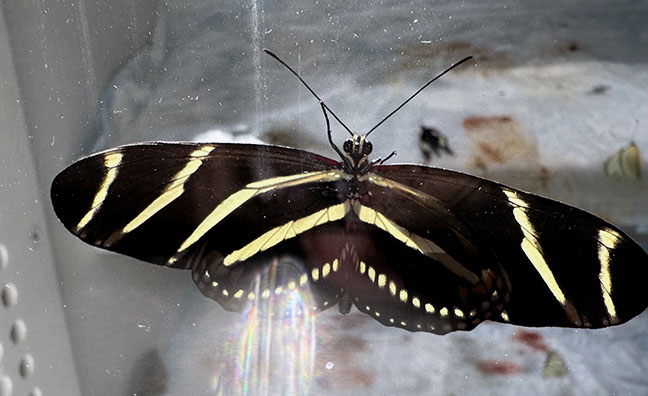 Hi from my zebra longwing buddy! We’re at Dow Gardens’ Butterflies in Bloom, where I volunteer on Wednesdays during the annual six-week exhibit, tending the new butterflies in the chrysalis cases. These photos were taken March 6, 2024, from behind the cases.