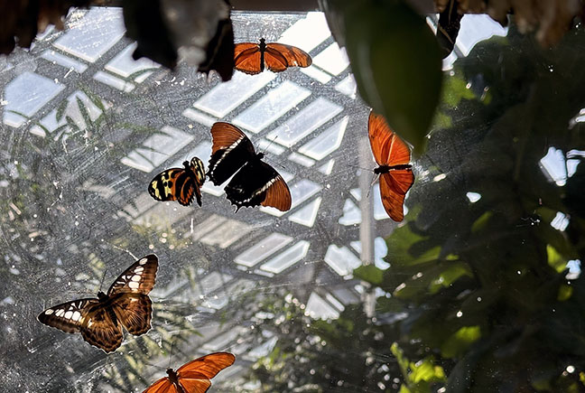 With visitors pressing up against the glass all day, it’s impossible to keep clean, sorry. I still like the stained glass effect of the butterflies with the sunlight pouring through.