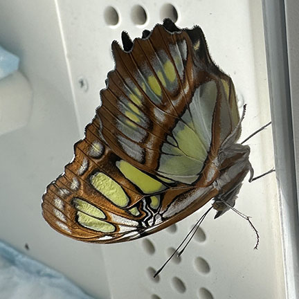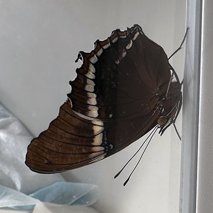 Our largest butterflies, the owls and blue morphos that are the size of your hand, can take half a day to dry. We let their activity level guide us. When they’re practically beating at the glass, it’s definitely time for release.
