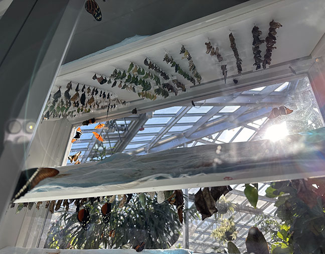 From the front, the two chrysalis cases in the Conservatory look like windows. From the back, as shown here, they look much the same, except we see much more than visitors do of the blue pads we put down and spray with water to keep the humidity in the cases up.