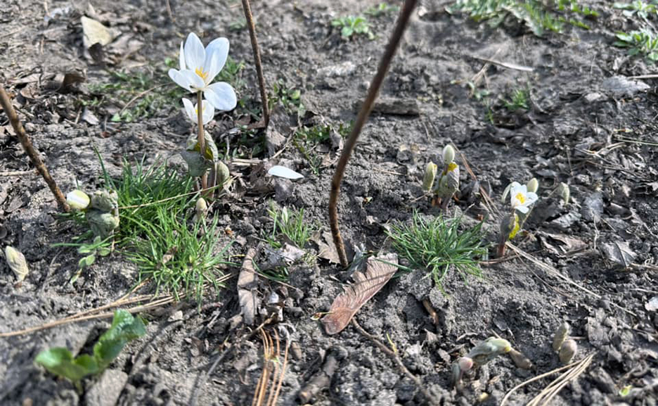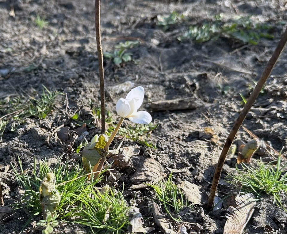 A bloodroot appeared overnight, so we caged it to protect it from Bigfoot aka Mosi.