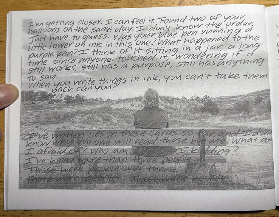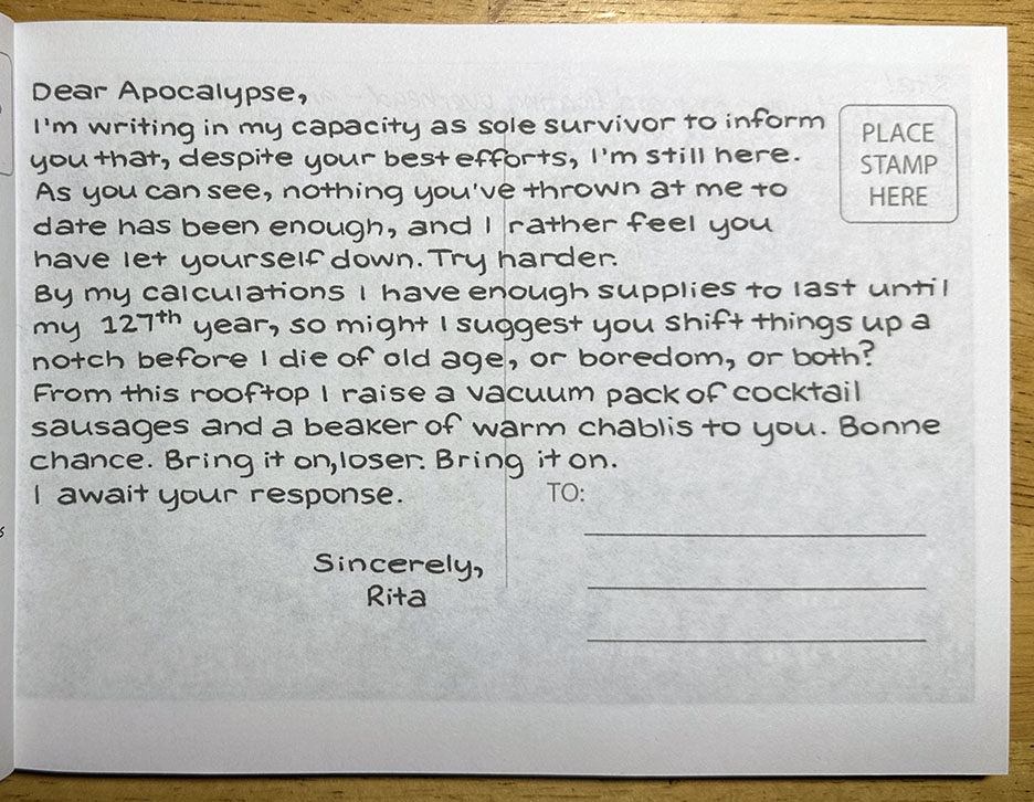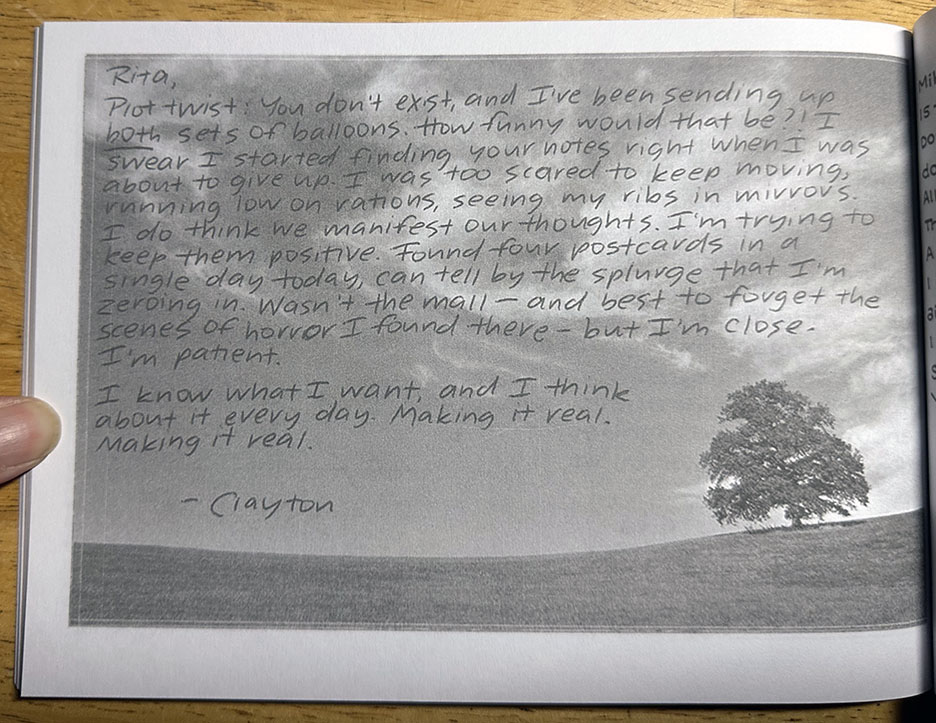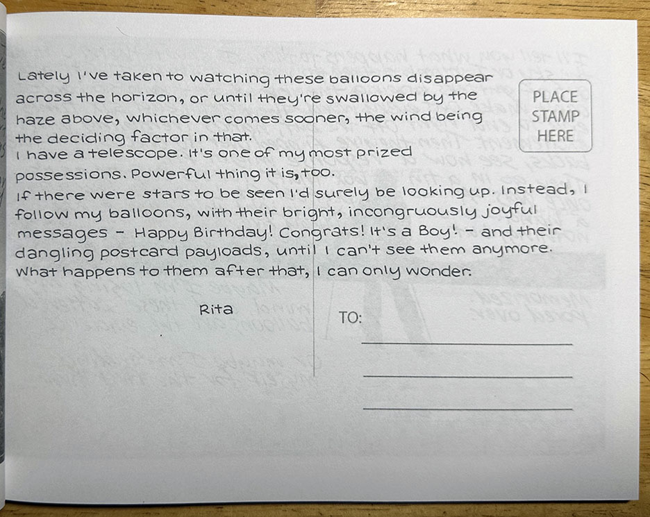 We learn that Rita writes postcards and releases them via helium balloon. What do the front pictures look like? Well, we learn that too, because someone else finds the postcards and writes his responses on the fronts before stashing them away for safekeeping. Here’s one from deeper in the book: